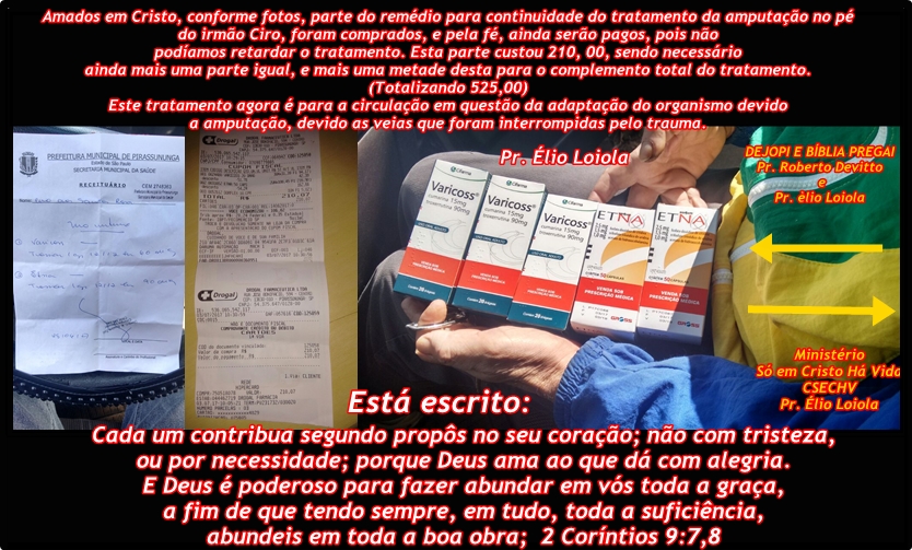 Para a glória de Deus, dos 525,00 reais necessários para os remédios referente ao tratamento do irmão Ciro, para circulação sanguínea e das veias sanguíneas, uma boa parte já foi provida.